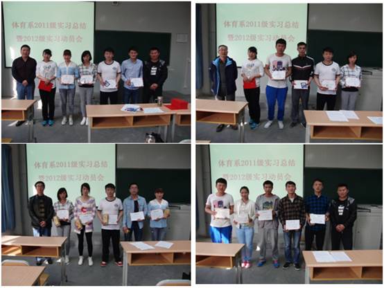 会上,首先由李强、索翠芳、姜亚荣、张涛等4名实习生代表分别做了教育实习总结报告,与师生们分享了他们在教育实习中收获的喜悦,介绍了他们在实习中的感受、体会和成功的经验,也总结了不足与教训。生动的事例和真实的感受赢得了全场阵阵掌声。接着,冯德学宣布了我系获得2014年学校教育实习优秀实习生名单和教育实习校内试讲阶段教案评比活动获奖名单,并向他们表示祝贺。随后举行了颁奖仪式,体育系领导为学校优秀实习生、优秀教案获奖者颁发了证书和奖品。