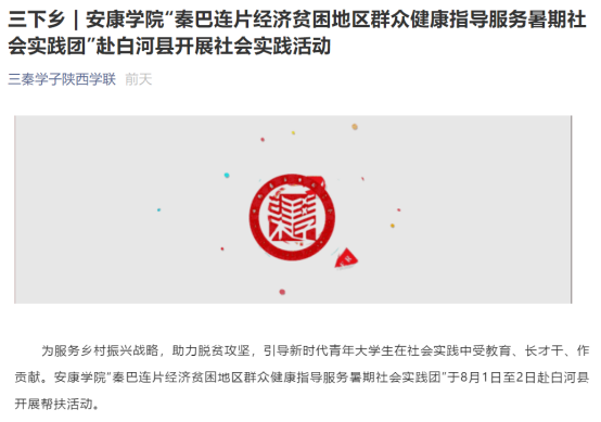 为服务乡村振兴战略,助力脱贫攻坚,引导和帮助新时代青年大学生在社会实践中受教育、长才干、作贡献,在校团委的精心策划、认真组织下,pp电子模拟器网站师生组建了秦巴连片经济贫困地区群众健康指导服务暑期社会实践团。于2020年8月1日至2日,pp电子模拟器官网一行20余师生赴白河县开展帮扶活动。其主题以“关注贫困地区群众健康,为健康中国战略护航”,通过大学生“三下乡”志愿者服务暑期社会实践白河行活动,为当地群众送上历久弥新的健康体育文化服务。