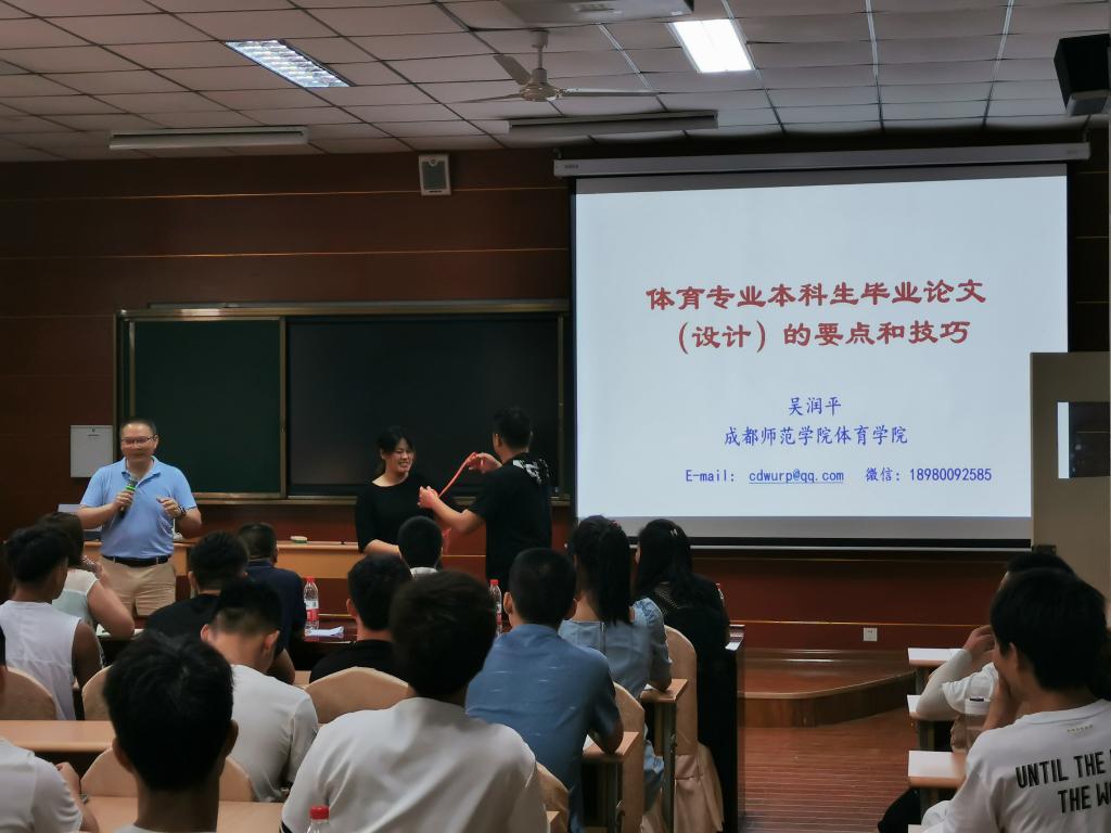 为提高pp电子模拟器官网学生毕业论文撰写技能,6月11日下午14:30,成都师范学院pp电子模拟器网站院长吴润平教授来pp电子模拟器官网做了以“体育专业大学生毕业论文(设计)的要点和技巧”为主题的学术讲座,pp电子模拟器网站全体18级、19级学生参加了本次报告会,报告会由学院党总支书记高立平主持。