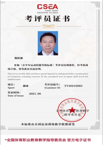 游泳是一项老少皆宜并深受人们喜爱的运动项目,它能够全面提高身体各系统的机能,改善体质水平,增进身心健康。同时,游泳也是一项重要的生存机能。为了促进安康游泳运动项目的发展,pp电子模拟器官网陈治强老师积极利用暑假时间,通过体教联盟平台进行线上学习,经过理论和实操两个环节的全面考核,获得了游泳项目考评员证书。游泳考评员资格的取得可以按照《青少年游泳运动技能等级标准》要求从事游泳项目考核相关工作,使考生能够在本地参与考核获取体教联盟认证的游泳项目等级证书,这对促进游泳项目的开展和学生学习的积极性具有重要意义。