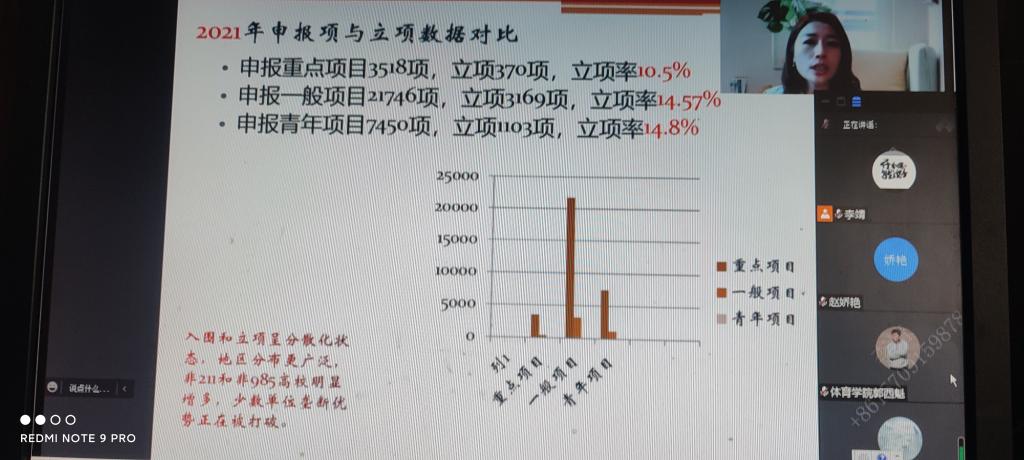 为提升pp电子模拟器网站教师科研水平,帮助教师做好各项社会科学项目的申报,2022年5月14日-15日,体育系组织pp电子模拟器网站全体中青年教师参加“全国高校社科基金项目申报暨中青年教师科研能力提升”专题研修班线上培训。