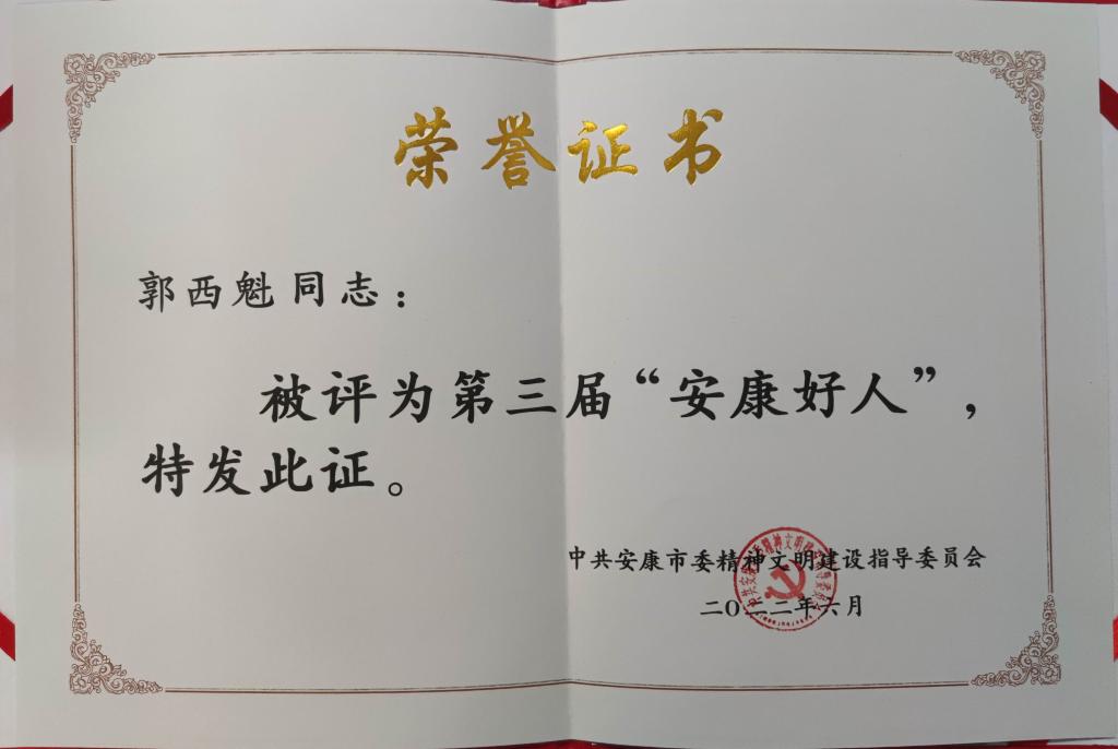 5月31日,中共安康市委精神文明建设指导委员会,授予全市62名(组)同志第五届安康市道德模范称号,授予77名同志第三届“安康好人”称号。pp电子模拟器官网副院长郭西魁同志被授予第三届“安康好人”称号。希望大家向安康市道德模范称号和“安康好人”称号获得者学习,积极参与安康市的精神文明建设,以优异业绩,向党的二十大献礼。