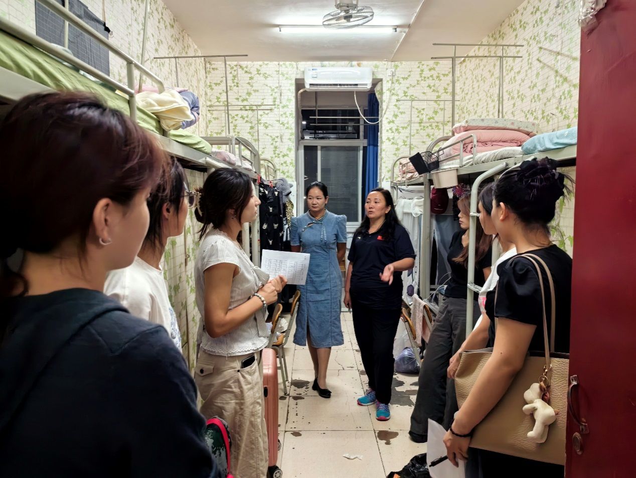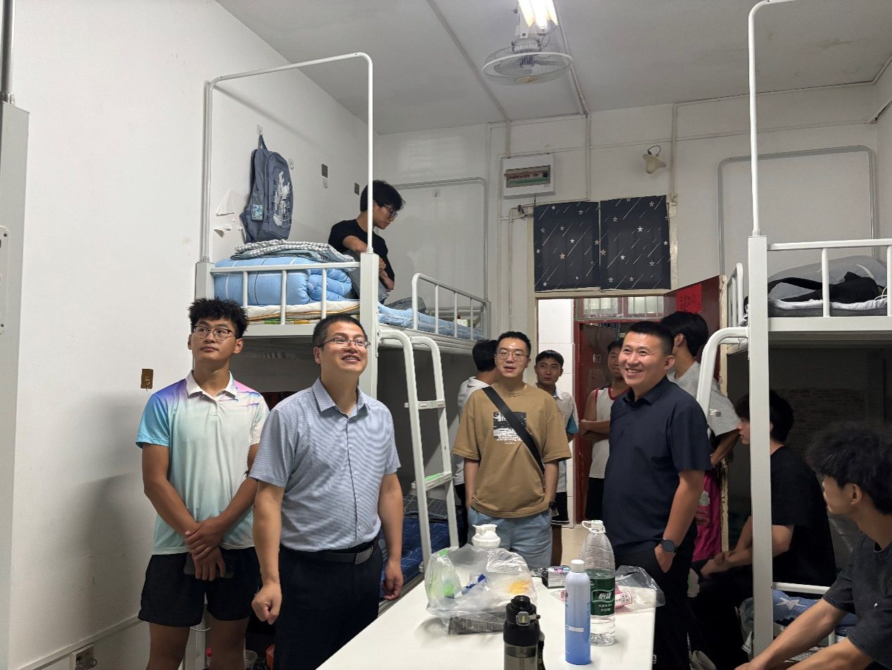 为深入了解2025级新生报到与住宿情况,帮助新生尽快适应大学环境,9月1日晚,pp电子模拟器网站一行深入学生公寓看望2025级新生。pp电子模拟器网站党总支书记韩晔,院长吕仙利,副院长郭西魁、李靖,团总支书记康梦瑶,新生辅导员陆传梓以及院学生会骨干成员一同参加走访。