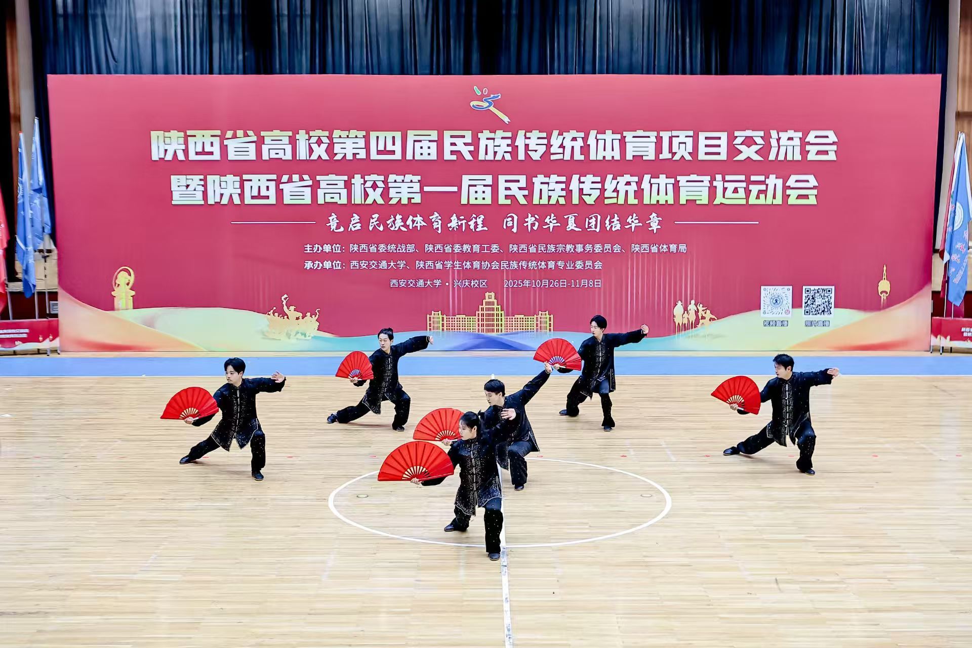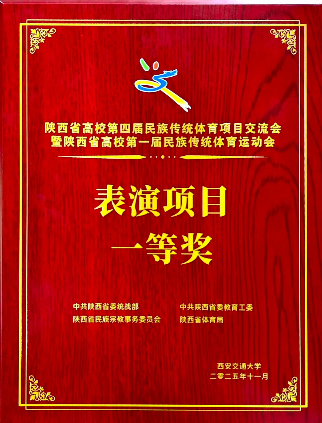 11月8日,由陕西省委统战部、陕西省委教育工委、陕西省民族宗教事务委员会、陕西省体育局联合主办的陕西省高校第四届民族传统体育项目交流会暨陕西省第一届民族传统体育运动会圆满落幕。pp电子模拟器官网武术队参加展演的太极扇项目获得一等奖,板凳龙项目获得优秀奖。