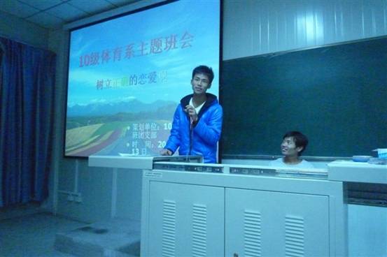 1120晚,体育系10号教学楼成功举行了“树立正确的恋爱观”的主题班会,辅导员梁鸿老师和体育教育10级全体学生参加了班会