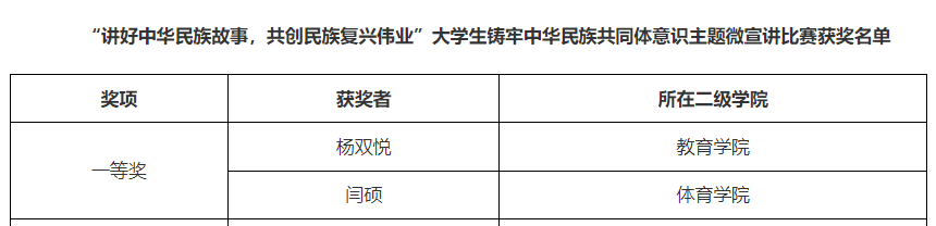 9月20日下午,学校在江南校区图书馆六楼报告厅举办了“讲好中华民族故事,共创民族复兴伟业”大学生铸牢中华民族共同体意识主题微宣讲比赛,pp电子模拟器官网体育教育专业2023级1班学生闫硕获一等奖。