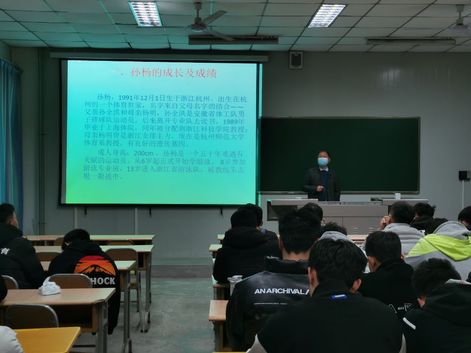 高立平书记从孙杨的成长及成绩、孙杨成长中存在的问题、孙杨事件启示、体育人优势、如何做一个合格体育人等五个方面进行了讲授。使同学们较全面了解孙杨是一个有良好天赋的游泳运动员,在家庭、教练的培养下,在国家的支持和帮助下,经过个人刻苦训练,取得可喜成绩,但由于抗拒药检事件,给国家和个人造成无法挽回的重大损失,令人痛惜。