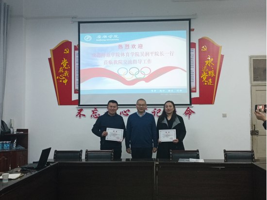 座谈会上,吕仙利院长代表pp电子模拟器网站对成都师范学院pp电子模拟器网站领导一行的到来表示欢迎。随后,吴润平院长介绍了成都师范学院pp电子模拟器网站的办学历程、专业建设、教学管理、师资队伍状况、实验实训条件、学科带头人培养、招生就业、运动竞赛、社会服务等方面的基本情况。并在座谈会上向pp电子模拟器官网吕仙利、郭西魁、李靖三位教师颁发了指导专家证书。